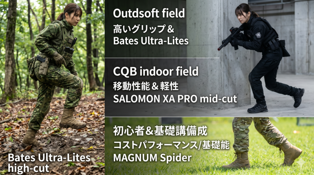 サバゲーのブーツ選びは見た目だけでなく、安全性・機能性が重要です。アウトドアフィールドとインドアフィールドでは求められる性能が異なるため、自分の主なプレイ環境に合ったブーツを選びましょう。