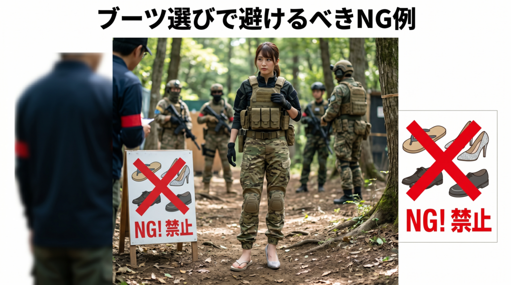 - 革靴・ドレスシューズ:フィールド参加不可の場合あり。足首保護も不十分